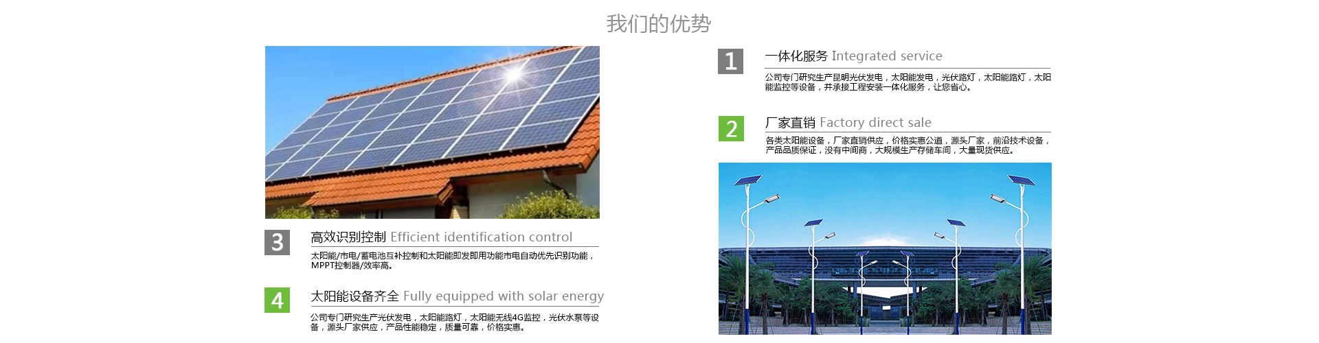 云南坦碩商貿有限公司是一家致力于光伏新能源發電系統的研發、設計、生產、銷售、安裝、維護于一體的綜合性能源企業。“新能源”是新世紀經濟發展中具前瞻性和決定力的科技能源產業之一,光伏太陽能是一種真正清潔、不枯竭的新能源,取之不盡,用之不竭。具有可靠、無噪音、無污染、制約少,故障率低,維護簡便等優點。我公司秉承:以質量求生存,以科技創新求發展,以現代化管理求效益、的管理體系,堅持“出精品設計造產品,創工程,守良好信譽”的質量方針,以標準的服務,優良的服務品質和創新技術的應用為客戶提供有針對性的、系統解決方案來贏得客戶的放心與認可。我公司主要研發、設計、生產銷售的產品有:各種規格型號的并網、離網光伏發電、以及家用光伏發電系統和光伏發電揚水系統,光伏抽水灌溉系統、光伏溫室烘干系統。我公司生產的光伏發電系統功率大小可調控,可以滿足各個領域的用電需求,如:高能耗大型企業單位,礦山、雷達站、景區索道、電動游樂觀光船...